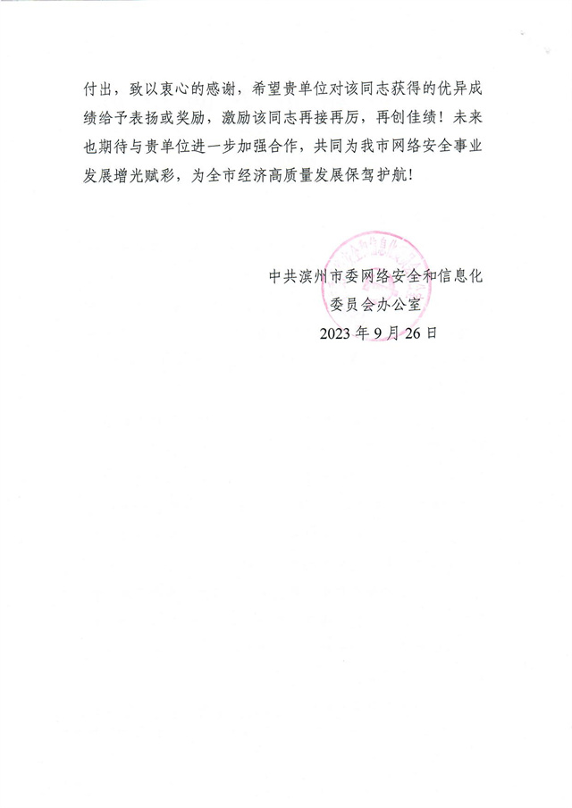 導(dǎo)讀:近日,公司收到一封來(lái)自濱州市委網(wǎng)信辦的感謝信