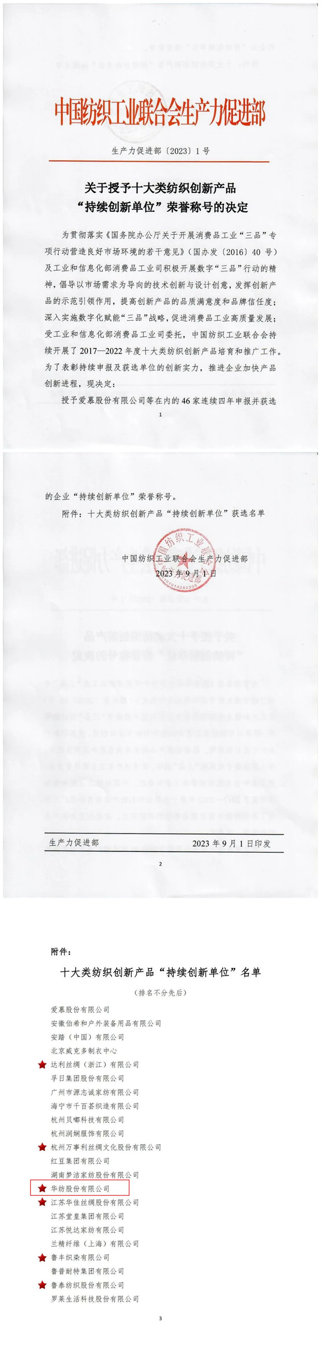 為表彰持續(xù)申報及獲選單位的創(chuàng)新實(shí)力,推進(jìn)企業(yè)加快產(chǎn)品創(chuàng)新進(jìn)程。近日,中國紡織工業(yè)聯(lián)合會生產(chǎn)力促進(jìn)部發(fā)布“關(guān)于十大類紡織創(chuàng)新產(chǎn)品‘持續(xù)創(chuàng)新單位’榮譽(yù)稱號的決定”,授予華紡股份有限公司等在內(nèi)的46家連續(xù)四年申報并獲選的企業(yè)“持續(xù)創(chuàng)新單位”榮譽(yù)稱號。