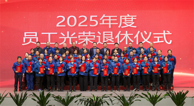 會(huì)議為2025年度退休員工舉行光榮退休儀式。公司黨委委員、紀(jì)委副書記、副總經(jīng)理孫玉濤宣讀退休員工名單,黨委書記、董事長盛守祥為退休員工代表頒發(fā)榮譽(yù)證書。退休員工代表王立松作為退休職工代表發(fā)言,深情訴說數(shù)十載與公司同行的點(diǎn)滴,誠摯送上對公司的衷心祝福。